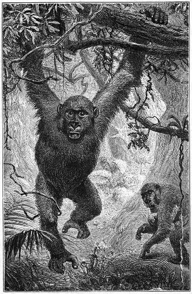 A Gorilla Hunt. Paul du Chaillu, in his "Stories of the Gorilla Country," gives a graphic description of his first sight of these "wild men of the woods." He was inspecting the ruins of a native village with a party of Africans, when they discovered footprints which the natives immediately recognised as those of the gorilla. "It was," says he, "the first time I had seen the footprints of these wild men of the woods, and I cannot tell you how I felt. Here was I now, it seemed, on the point of meeting, face to face, that monster, of whose ferocity, strength and cunning, the natives had told me so much, and which no man before had hunted. By the tracks it was easy to know that there must have been several gorillas in company. We prepared at once to follow them. My men were remarkably silent, for they were going on an expedition of more than usual risk; for the male gorilla is literally the king of the forest—the king of the equatorial regions. He and the crested lion of Mount Atlas are the two fiercest and strongest beasts of that continent. The lion of South Africa cannot be compared with either[Pg 6] for strength or courage. As we left the camp, the men and women left behind crowded together, with fear written on their faces. Miengai, Ngolai, and Makinda set out for the hunt in one party; myself and Yeava formed another. We determined to keep near each other, so that in case of trouble we might be at hand to help one another. For the rest silence and a sure aim were the only cautions to be given. I confess that I was never more excited in my life. For years I had heard of the terrible roar of the gorilla, of its vast strength, of its fierce courage when only wounded. I knew that we were about to pit ourselves against an animal which even the enormous leopards of the mountains fear, which the elephants let alone and which perhaps has driven away the lion out of his territory; for the king of beasts, so numerous elsewhere in Africa, is not met with in the land of the gorilla. We descended a hill, crossed a stream on a fallen log, crept under the trees, and presently approached some huge boulders of granite. In the stream we had crossed we could see plainly that the animals had just crossed it, for the water was still disturbed. Along side of the granite blocks lay an immense dead tree, and about this the gorillas were likely to be. Our approach was very cautious. With guns cocked and ready we advanced through the dense wood, which cast a gloom even at mid-day over the whole scene. I looked at my men and saw that they were even more excited than myself. Slowly we pressed on through the dense bush, dreading almost to breathe for fear of alarming the beasts. Makinda was to go to the right of the rock, while I took the left. Unfortunately he and his party circled it at too great a distance. The watchful animals saw him. Suddenly I was startled by a strange, discordant, half human cry, and beheld four young and half-grown gorillas running towards the deep forest. I was not ready. We fired but hit nothing. Then we rushed on in pursuit; but they knew the woods better than we. Once I caught[Pg 7] a glimpse of one of the animals again; but an intervening tree spoiled my mark, and I did not fire. We pursued them till we were exhausted, but in vain. I protest I felt almost like a murderer when I saw the gorilla this first time. As they ran on their hind legs with their heads down, their bodies inclined forward, their whole appearance was that of hairy men running for their lives. Add to this their cry, so awful yet with something human in its discordance, and you will cease to wonder that the natives have the wildest superstitions about these 'wild men of the woods.'"