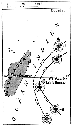 La régularité de cette marche du nord-est au sud-est, en passant par l'ouest, fut constatée, il y a une cinquantaine d'années, par M. Bridet, ancien capitaine de frégate, établi à la Réunion; elle a été observée depuis lors par tous les navigateurs.