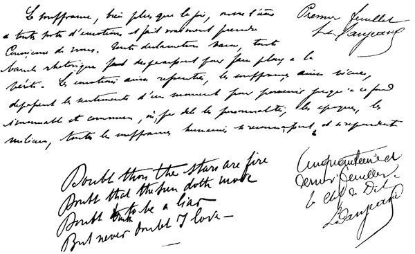 C'est pour toi seule que j'ai résisté jusqu'aujourd'hui; c'est pour toi seule, mon adorée, que j'ai supporté ce long martyre. Mes forces me permettront-elles d'aller jusqu'au bout? Je n'en sais rien. Il n'y a que toi qui puisses me donner du courage; c'est dans ton amour que j'espère le puiser...