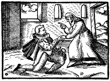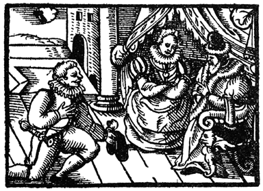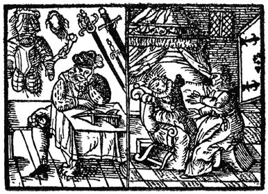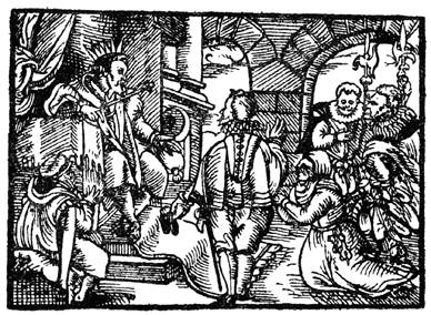 Als der Graf und die Gräfin solchen Fürsatz und Willen ihres Sohns vernahmen, wußten sie nicht, was ihnen darinne zu tun geziemen wölle: ihrem Sohn sein Bitten und Begehr abzuschlagen, oder zuzusagen. Wann ihr Sohn Peter blieb also auf den Knien, beider Antwort anzuhören. Und als er vermerket ihr lang Stillschweigen, fing er wieder an zu bitten also: „Aller liebster Herr Vater, mein untertänigst Bitten ist nochmals, ihr wollet mir gnädiglich erlauben!“