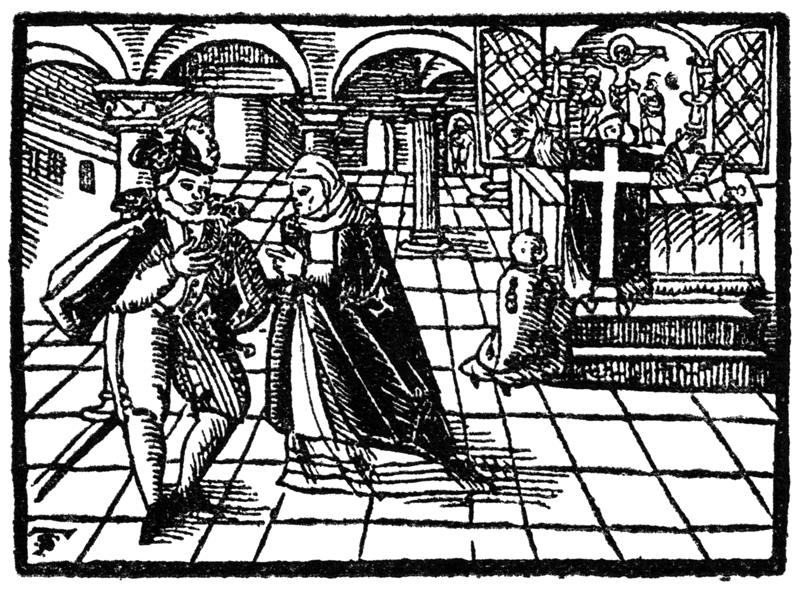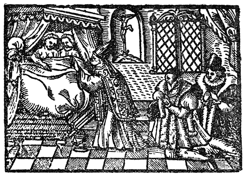 Als nun der Sonntag kam, da nahm der Graf die Gräfin und sein Gesinde, und zogen zu Sankt Peter von Magelon und hörten da Messe. Als die Messe ein Ende hätt, nahm die Spitalerin den Graf und die Gräfin ein jegliches auf ein Seiten und sprach zu ihnen, sie wölle gerne mit ihnen etwas 95in geheim reden, doch müßten sie mit ihr in ihre Kammer kommen; darein sie dann gerne bewilligten.