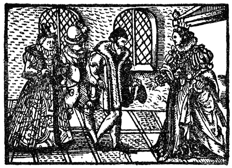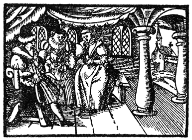 Der edel Ritter verwandelt auch nicht weniger seine Farbe, da er vor sich sah die aller Schönest und Liebste seines Herzens. Er wußte auch nicht, wie er an sollte fahen zu reden; wann er wußte nicht, ob er in Lüften oder auf Erdreich war; als dann die Liebe ihren Untertanen pfleget zu beweisen und tun. Jedoch kniet er nieder ganz schamhaftig vor sie und sprach: „Großmächtige hochgeboren Fürstin, der allmächtige GOTT verleihe euch Ehr und alles, das euer Herz begehret!“