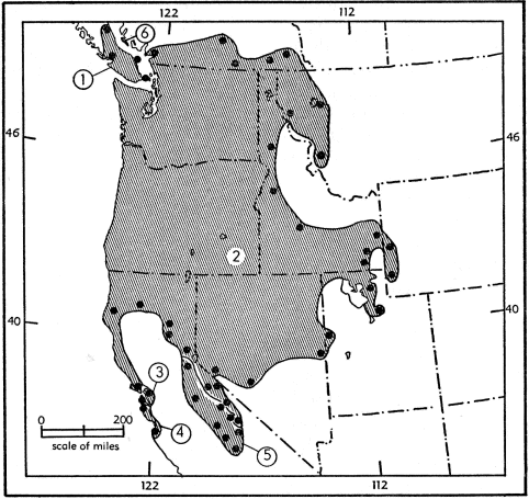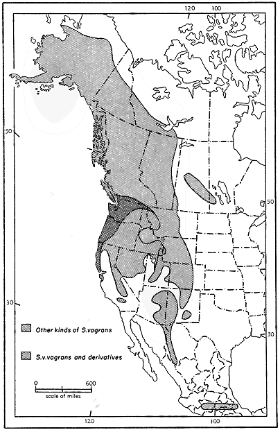 One possible series of events culminating in the formation of the Sorex vagrans rassenkreis may be thought of as having begun during the Illinoian age. With much of Canada, and perhaps also many areas in the Rockies, Cascades, and the Sierra Nevada covered with glacial ice, the shrew-stock ancestral to Sorex vagrans may well have occupied a more or less continuous range over the Colorado Plateau, the Columbian Plateau, the Great Basin, and in the forests of the Pacific Coast (as well as over part of eastern United States, as will [Pg 19] be explained beyond; see fig. 7). At that time the species probably was a continuously interbreeding unit.