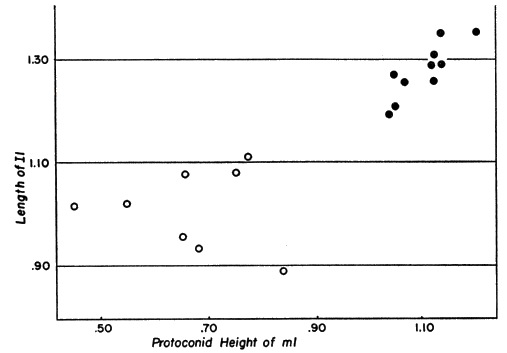 Several students of American shrews, notably Pearson (1945) on Blarina, Hamilton (1940) on Sorex fumeus, and Conaway (1952) on Sorex palustris, have shown that young are born in spring and summer, usually reach sexual maturity the following spring, and rarely survive through, or even to, a second winter. The result is that collections made, as most of them are, in spring and summer, contain two age classes, first year and second year animals. These two age classes are readily separable on the basis of differences in the skull as well as on the decreased pubescence of the tail and the increased weight of second year animals. My own examination of hundreds of museum specimens confirms this for the Sorex vagrans group. Separation of the two age classes in an August-taken series of Sorex vagrans from coastal Washington is shown in figure 3, in which two tooth-measurements that are dependent upon wear are plotted against one another.