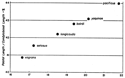 The largest shrews of the vagrans group (large in all dimensions) occur in the coastal forests of northern California and of Oregon. Those shrews are reddish, large-skulled, large-toothed, and have rostra that are large in proportion to the size of the skull as a whole. The very largest of these shrews live along the coast of northwestern California. To the southward they are somewhat smaller, and at successively more northern localities, to as far as southwestern British Columbia, they are likewise progressively smaller and also somewhat less reddish. The relative size of the rostrum decreases with the decrease in size of the skull; consequently smaller shrews have relatively smaller rostra (see fig. 4). In addition the zygomatic ridge of the squamosal decreases in relative size with decrease in actual size of the skull. Thus, these features change in a clinal fashion as one proceeds from, say, Humboldt County, California, northward to Astoria, Oregon.