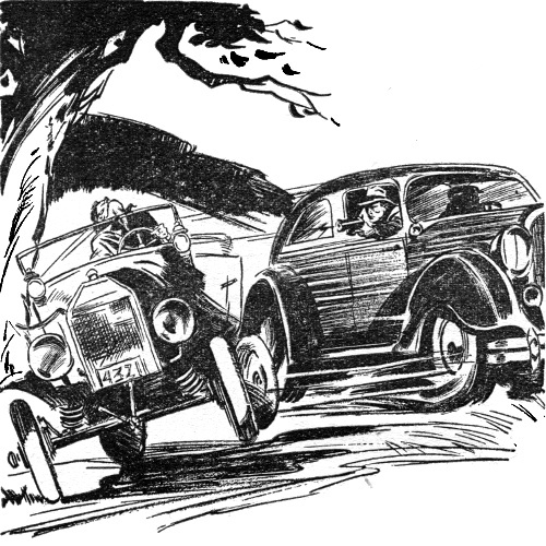 "Gangway, muscle man!" Black Hood's voice rang out, and then like a slim arrow unleashed from a taut drawn bow Black Hood sped up the tarvia drive toward where the low slung roadster that belonged to Jeff Weedham was parked.