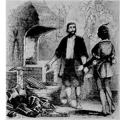 Alpinolo le voyant seul dans la boutique, occupé à tirer paisiblement le soufflet de la forge, et à tourner, sans se presser davantage, un morceau de fer dans les charbons, ne craignit pas d'interrompre son travail; il commença donc à lui parler plus longuement, et après avoir déploré la misère des temps, il lui fit entrevoir qu'elle pourrait bientôt prendre fin.