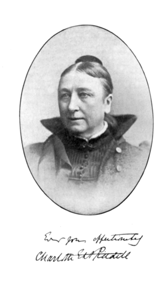 The gentle, quiet face tells its tale of early struggles, heavy burdens, severe trials; yet time has not laid its ruthless hand over-harshly on the author. Not a silver hair is visible on the soft, brown hair, which is simply rolled into a neat coil, high on the back of her head, and fastened by a large tortoise-shell comb. The deep grey eyes are undimmed, and wear a look of peace and resignation, nobly won; while "ever and anon of griefs subdued, there comes a token" which recalls the past. But Mrs. Riddell can smile sweetly, and when she smiles, two—yes two—absolutely girlish dimples light up the expressive countenance. She is tall, has a good carriage, and is dressed in black; she has worn no colours for over ten years.