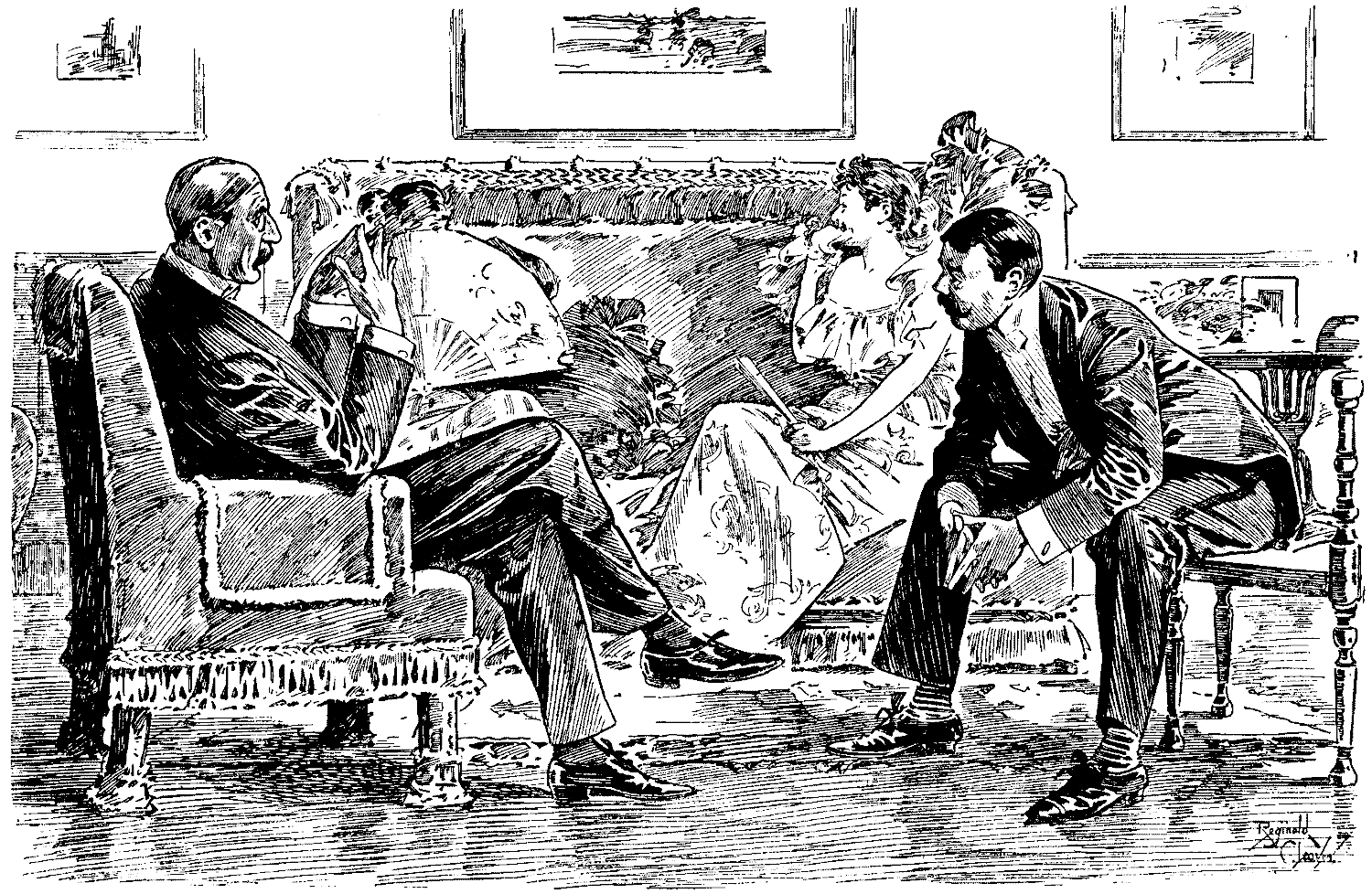 "Haven't you heard," he said, as he mopped his forehead, "of the Secret Society, sworn to decimate us fellows of the War Office? Began with St. John Brodrick, who narrowly escaped assassination in the streets; went on to Campbell-Bannerman, who was threatened with sudden death. Now they've turned their attention on me. Every post brings an anonymous letter, advising me that my end approaches. They are in different handwriting, but the note-paper enjoys in common the adornment of a death's-head and cross-bones. Sometimes there's a coffin underneath; occasionally this accessory is omitted; it is made up for in the added ferocity of the communication. This makes one very uneasy. I daresay you have observed how stout Campbell-Bannerman looks of late. It's only his shirt of mail, worn under his ordinary linen. He says he's going to Marienbad to get rid of it; that's only his joke. As for me, I don't think it's worth mincing matters. I, as you see, go the whole animal; but it's very wearing. Sandhurst told me it was a case of armour or assassination. Having tried the armour for three days, am not quite sure I should not prefer assassination. Excuse me, there's a strange man lingering in the corner."