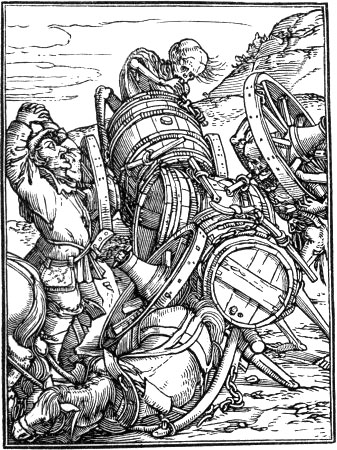 [101] The dedicator has apparently in this place been guilty of a strange misconception. The Death is not sucking the wine from the cask, but in the act of untwisting the fastening to one of the hoops. Nor is the carman crushed beneath the wheels: on the contrary, he is represented as standing upright and wringing his hands in despair at what he beholds. It is true that this cut was not then completed, and might have undergone some subsequent alteration. He likewise speaks of the rainbow in the cut of the Last Judgment, as being at that time unfinished, which, however, is introduced in this first edition.