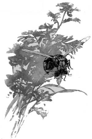 "Do you wonder that I am as blue as indigo, and am occasionally forced to resort to my oil-tank to still the troubled waters of my later experience? Well, as I was saying (pardon this fresh display of tears), when I crept out of that filmy egg-sac I was just ready for anything, and spoiling for adventure. I found myself with a slender, agile body of thirteen joints, and three pairs of the sprightliest, spider-like legs you ever saw, each tipped with three little sharp claws. Now I knew that these long legs and claws were not given to me at this early babyhood for nothing, so I looked about for something to try them on. I had not a great while to wait, for as I crept along through the grass roots beneath the edge of the stone, I heard a welcome sound, which is music to all babies of my kind. I remembered having heard the same music in my dreams while inside the little yellow case, but now it seemed louder than ever, and in another minute I was almost blown off my feet by the breeze which the noise made, and a great black, hairy giant, as big as a house, pounced down just outside the stone. He had a great black head, and six enormous legs as big round as trees. Think how a bumblebee would look to a wee baby not half as big as a[6] hyphen in one of your books! Did I run when I saw him coming? Not a bit of it. I just waited until he came close to me, and then I jumped on his back, and put those eighteen little claws of mine to good use as I crept over his great spiny body, and finally found a snug resting-place beneath it. And then I waited, clinging tightly with my clutching feet. In another moment I had begun to take my first outing; and did ever baby have such a ride, and to such music! After the bumblebee had remained under the stone a little while he turned and went[7] out again. No sooner did he get to the edge than he spread his great buzzing wings, and away we went over the world, higher and higher, miles high, over big oceans and mountains. I could see them all beneath me as I clung to the underside of the bee. I believe I must finally have got dizzy and faint, for I remember at last finding myself at rest in a queer thicket of greenish poles with big yellow balls at the top of them, and great giant leaves fringed with long, glistening hairs. They told me afterwards it was a willow blossom.
