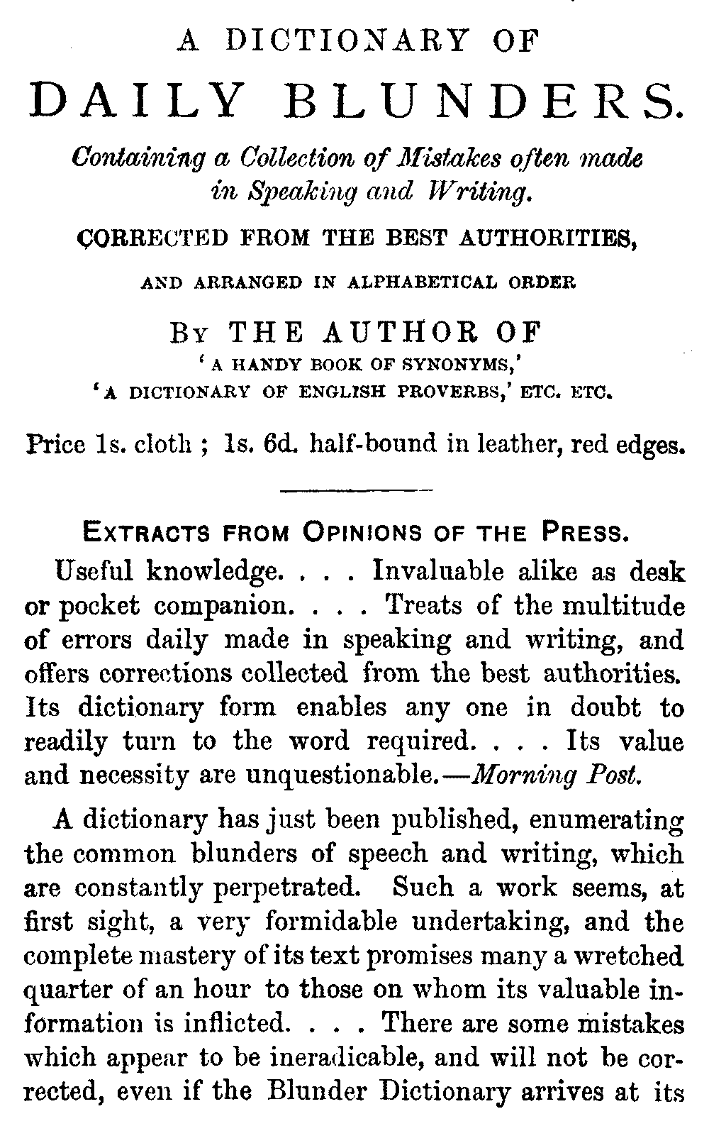 This series of "Handy Books" would hardly be complete without a collection of English Proverbs. Many books on the subject have been written, but it is hoped that this collection will, in some respects, be found to be an improvement on all its predecessors. Like The Dictionary of Daily Blunders, this Dictionary of English Proverbs has been framed so as to enable the reader to find what he wants without difficulty. The Dictionary itself is arranged according to the principal words, and there is also a Copious Index of additional principal words.