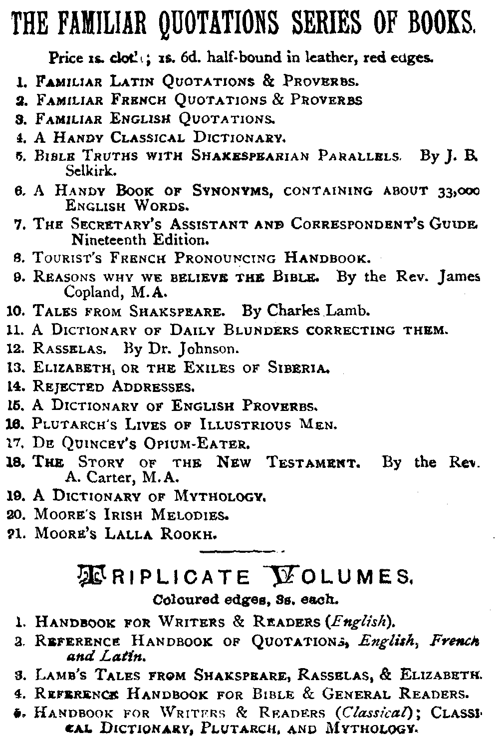 A very handy little book. It contains, arranged in alphabetical order, all the most common Latin quotations [A7]with their signification, and many which are not so well known. The author has been careful in doing his work, and has produced a really good little book of reference.—Scotsman.