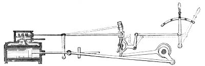 The valve-motion was given by a single fixed eccentric for each cylinder. Each eccentric-strap had two arms attached to it, one above and the other below, and, as the driving-axle was back of the fire-box, these arms were prolonged backward under the footboard, with a hook on the inner side of the end of each. The rock-shaft had arms above and below its axis, and the hooks of the two rods of each eccentric were moved by hand-levers so as to engage with either arm, thus producing backward or forward gear. This form of single eccentric, peculiar to Mr. Baldwin, was in the interest of simplicity in the working parts, and was adhered to for some years. It gave rise to an animated controversy among mechanics as to whether, with its use, it was possible to get a lead on the valve in both directions. Many maintained that this was impracticable; but Mr. Baldwin demonstrated by actual experience that the reverse was the case.
