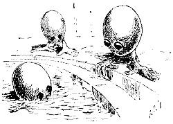["The descendants of man will nourish themselves by immersion in nutritive fluid. They will have enormous brains, liquid, soulful eyes, and large hands, on which they will hop. No craggy nose will they have, no vestigial ears; their mouths will be a small, perfectly round aperture, unanimal, like the evening star. Their whole muscular system will be shrivelled to nothing, a dangling pendant to their minds."—Pall Mall Gazette, abridged.]
