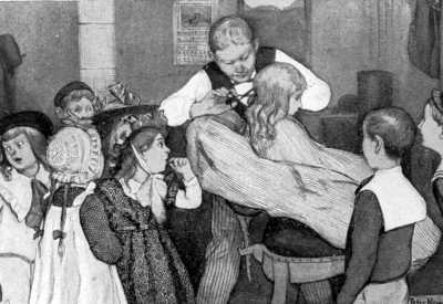 "Come on," cried little Cora. "Let's all get our hair cut. That's what let's do. Let's all get our hair cut! Come on! Come on! Come on!" The others were carried off their feet by the fury of this assault. To get their hair cut! What joy! Little did they know if this were fun; they only knew that their small leader said it was fun. Chocolate-stained but confident, the band marched into William Neeltje's barber shop.