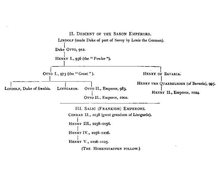 Division of Charlemagne's territory into three—Rudolf the Guelf—Swabian Dukes—Genealogical tables.