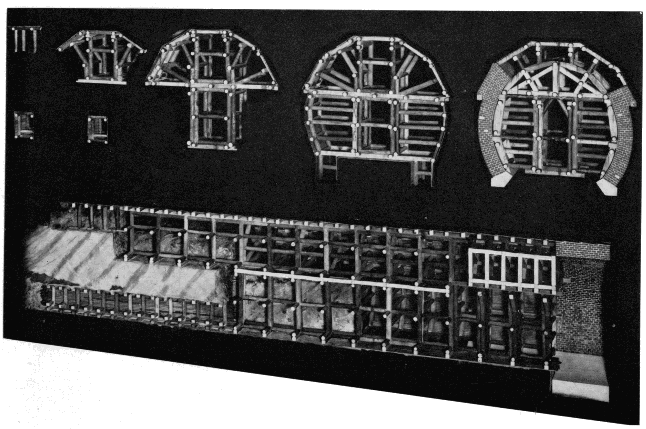 The plan to use a uniform scale of reduction throughout, in order to facilitate the viewers’ interpretation, unfortunately proved impractical, due to the great difference in the amount of area to be encompassed in different models, and the necessity that the cases holding them be of uniform height. The related models of the Broadway and Tower Subways represent short sections of tunnels only 8 feet or so in diameter enabling a relatively large scale, 1½ inches to the foot, to be used. Conversely, in order that the model of Brunel’s Thames Tunnel be most effective, [206] it was necessary to include one of the vertical terminal shafts used in its construction. These were about 60 feet in depth, and thus the much smaller scale of ¼ inch to the foot was used. This variation is not as confusing as might be thought, for the human figures in each model provide an immediate and positive sense of proportion and scale.