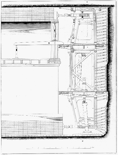 Figure 35.—Vertical section through the Beach shield used on the Broadway Subway, showing the horizontal shelves (C), iron cutting ring (B), hydraulic rams (D), hydraulic pump (F), and rear protective skirt (H). (Scientific American, March 5, 1870.)