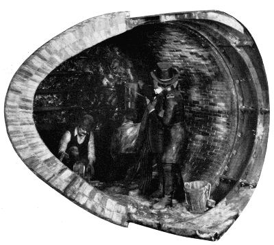 The first man to perceive and seize upon the benefits to be gained by combining the two systems was, most fittingly, Greathead. Although he had projected the technique earlier, in driving the underground City and South London Railway in 1886, he brought together for the first time the three fundamental elements essential for the practical tunneling of soft, water-bearing ground: compressed-air support of the work during construction, the movable shield, and cast-iron, permanent lining. The marriage was a happy one indeed; the limitations of each system were almost perfectly overcome by the qualities of the others.