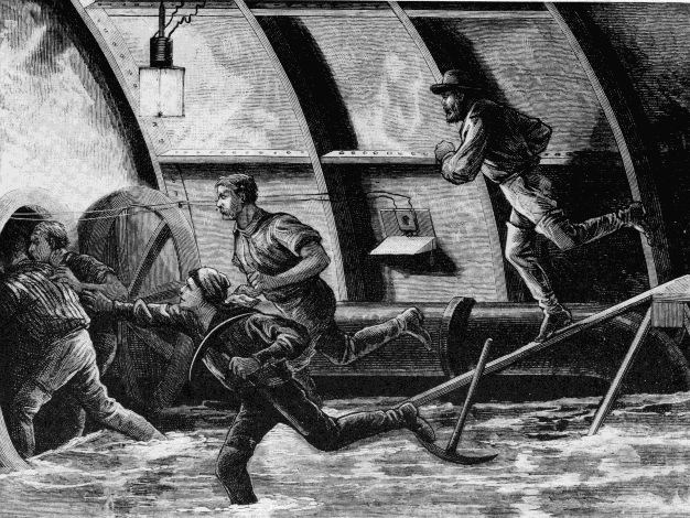 Despite the ultimate success of Brunel’s Thames Tunnel in 1843, the shield in that case afforded only moderately reliable protection because of the fluidity of the soil driven through, and its tendency to enter the works through the smallest opening in the shield’s defense. An English doctor who had made physiological studies of the effects on workmen of the high air pressure within diving bells is said to have recommended to Brunel in 1828 that he introduce an atmosphere of compressed air into the tunnel to exclude the water and support the work face.