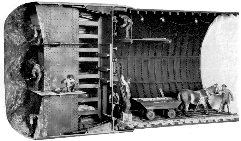 The remainder of the material in the Museum’s tunneling section further extends the two major aspects of tunneling. Space limitations did not permit treatment of the many interesting ancillary matters vital to tunnel engineering, such as the unique problems of subterranean surveying, and the extreme accuracy required in the triangulation and subsequent guidance of the boring in long mountain tunnels; nor the difficult problems of ventilating long workings, both during driving and in service; nor the several major methods developed through the years for driving or constructing tunnels in other than the conventional manner. [1]
