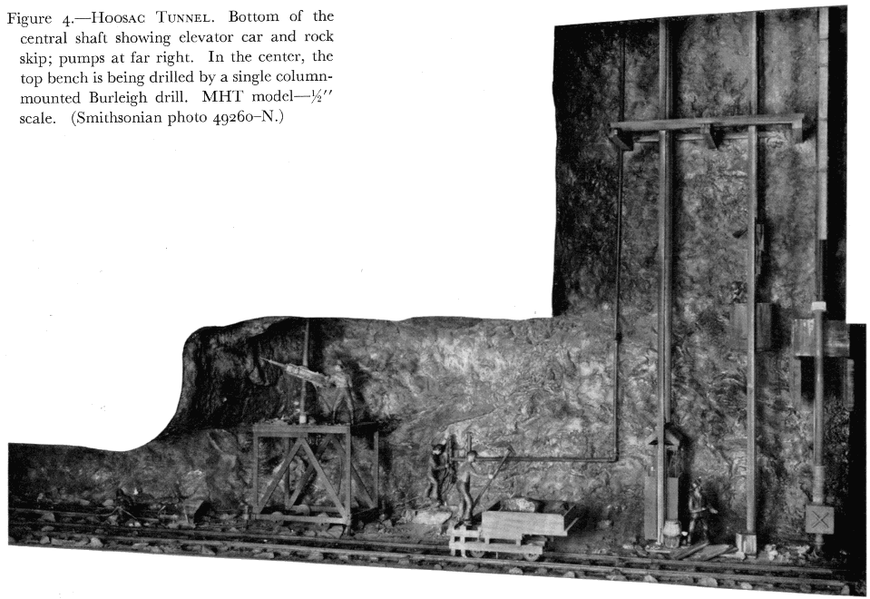 The tunnel’s 1028-foot central shaft, completed under the Shanley contract in 1870 to provide two additional work faces as well as a ventilation shaft is shown at the far right side of this half of the model. Completed so near the end of the project, only 15 percent of the tunnel was driven from the shaft.