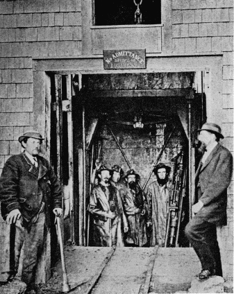 Figure 7.—Hoosac Tunnel. Group of miners descending the west shaft with a Burleigh drill. (Photo courtesy of State Library, Commonwealth of Massachusetts.)