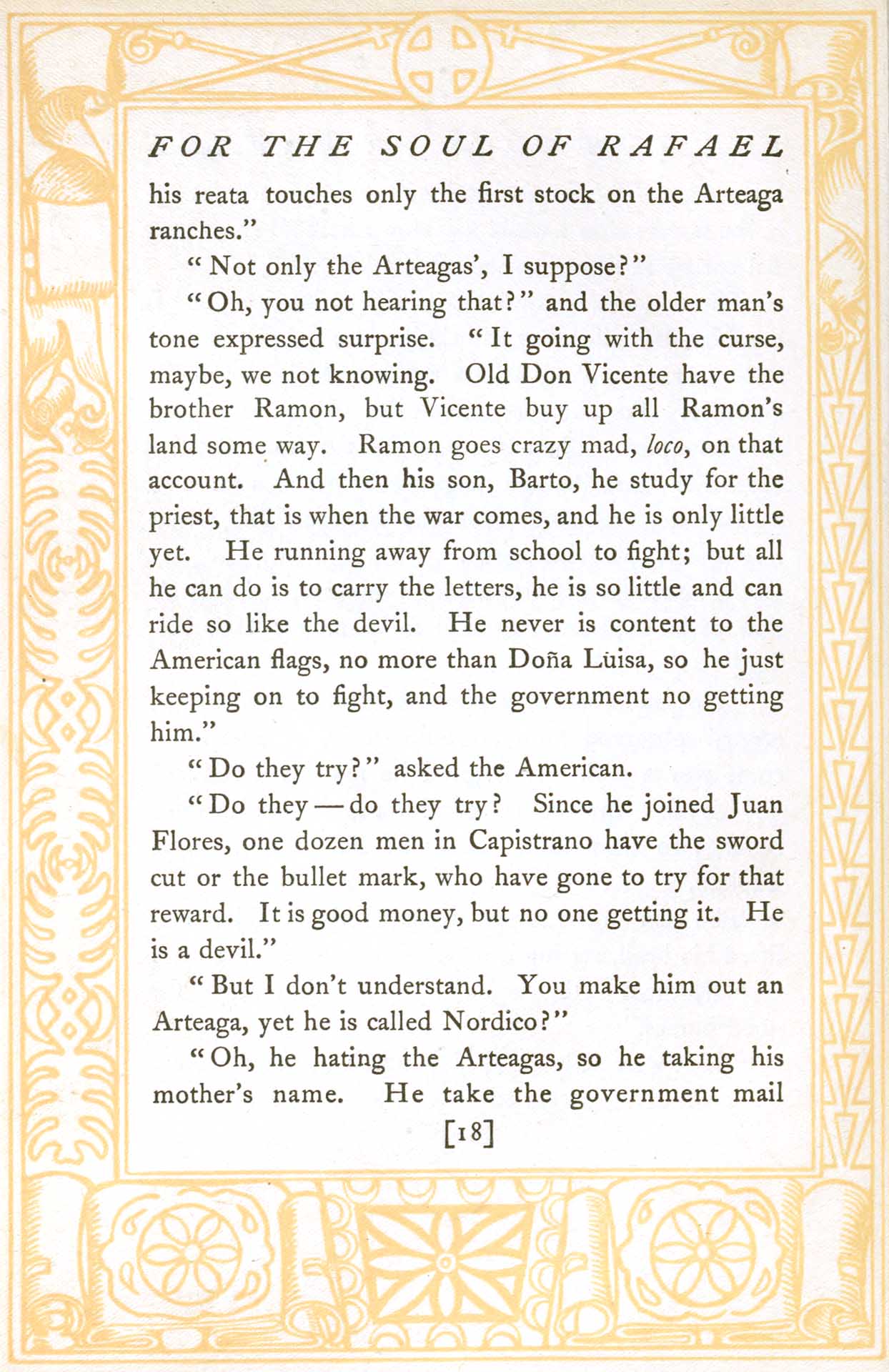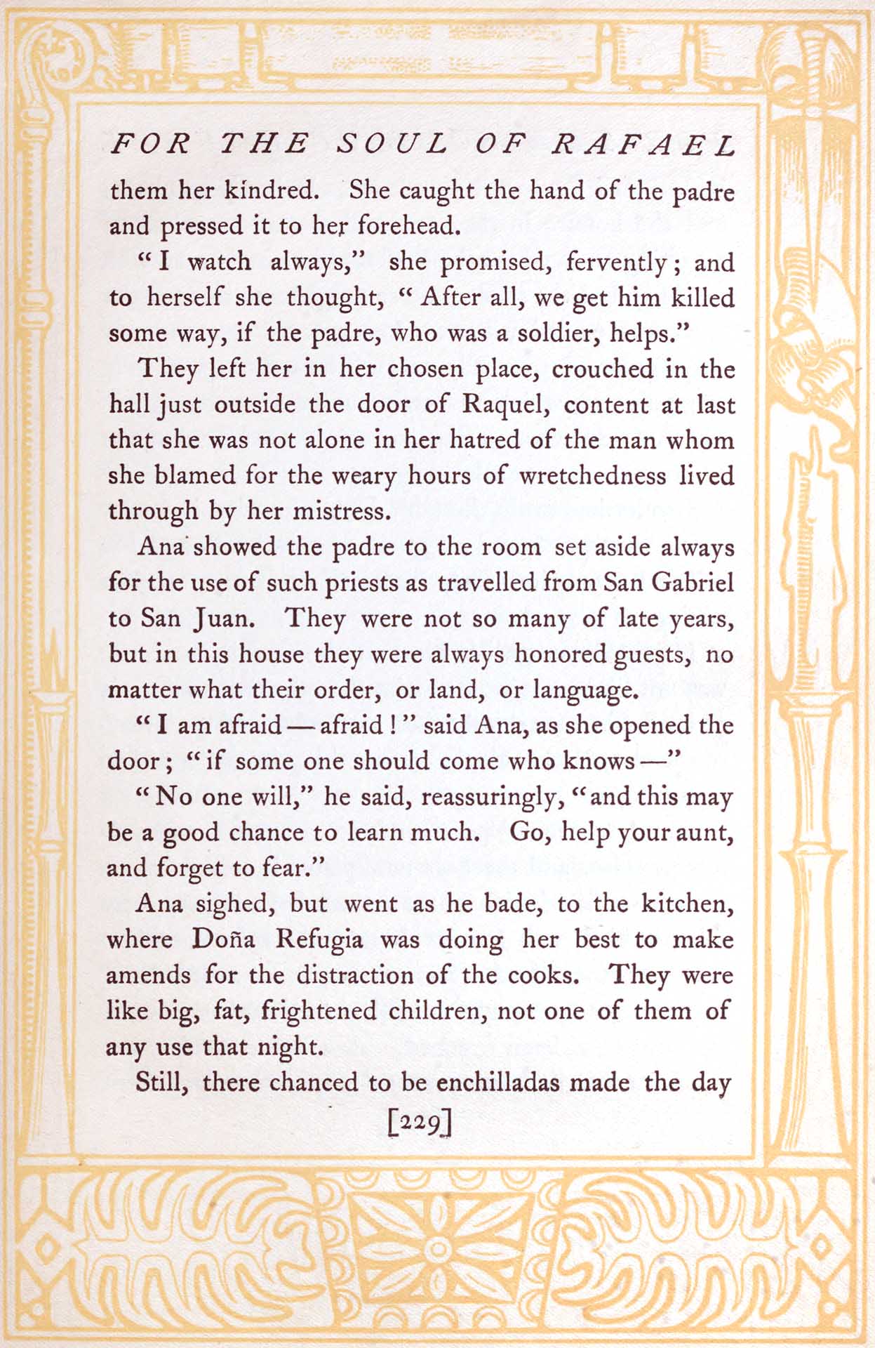 "Sure! Doña Luisa she marry Don Vicente, here in San Juan Capistrano. It is here he have the big trouble with the padre, and the padre put the curse on him that long time ago. It is here that he is brought back dead from San Pascual. And now when the sons have make much trouble, all are dead but two, and when Doña Luisa, who was so proud, has only Indian grandchildren, she wants to marry Rafael to a señorita who is half a nun, that the curse may be [15] lifted. She think that girl do more to keep him from walking in Miguel's shoes than prayers to the saints can do; and it may be,—who knows? I hear you talking of the padre's curse to the Alcalde, so I know you hearing the story."