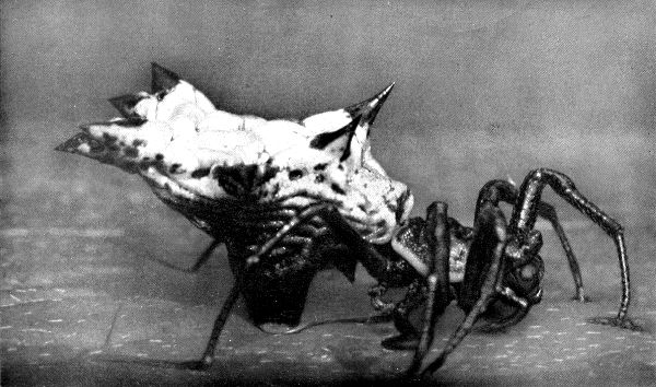 In enlarging the images of these small spiders to many times their size, one is at once struck by their similarity to crabs and lobsters. Their jointed legs encased in shells, which from time to time they shed, remind one strongly of the crabs, and they do in fact belong to the some great family, the family of arthropods, and they are not insects.