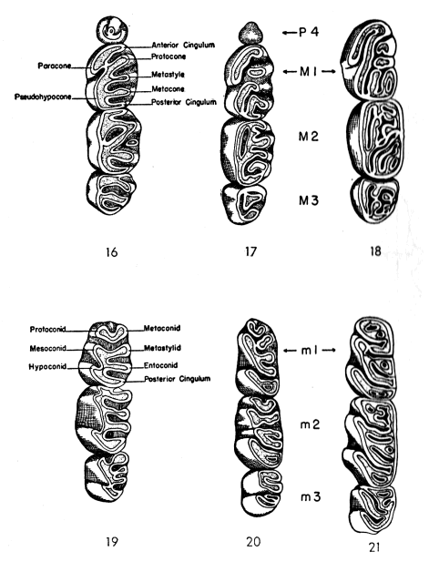 If Macrognathomys can be considered a member of the subfamily Zapodinae (possibly it is a sicistine) then it represents the oldest known member of this subfamily. Judging from the published illustrations, Macrognathomys seems to be structurally ancestral to the Mid Pliocene Pliozapus solus Wilson; the labial re-entrant folds are wider and shorter and on m2 and m3 fewer. The difference in stage of wear of the teeth in Macrognathomys and Pliozapus is a handicap in comparing the two genera but they are distinct. Wilson (1936:32) points out that Pliozapus clearly falls in the Zapodinae and stands in an ancestral position with respect to the structurally progressive series Eozapus, Zapus, and Napaeozapus. Nevertheless, Pliozapus cannot be considered as directly ancestral to Eozapus because of the progressive features in the dentition of Pliozapus. Wilson (1937:52) remarked that if Pliozapus is ancestral to Zapus and Napaeozapus, considerable evolution must have taken place in the height of crown and in the development of the complexity of the tooth pattern. In contrast to Wilson’s opinion, Stehlin and Schaub (1951:313) placed Pliozapus and Eozapus in the subfamily Sicistinae because certain elements in the occlusal pattern of the cheek-teeth are similar. I disagree with those authors and hold with Wilson; I consider Pliozapus and Eozapus in the subfamily Zapodinae. In dental pattern Pliozapus, as Wilson (1936:32) pointed out, resembles the Recent Eurasiatic sicistid, Sicista more than do Zapus or Napaeozapus. Nevertheless, from Sicista Wilson distinguishes Pliozapus and relates it to the subfamily Zapodinae by: "more oblique direction of protoconid-hypoconid ridge, anterior termination of this ridge at buccal portion of protoconid rather than between protoconid and metaconid as in Sicista; cusps more compressed into lophs; cheek-teeth somewhat broader; greater [357] development of metastylid; greater development of hypoconulid ridge, … absence of anteroconid…."