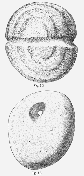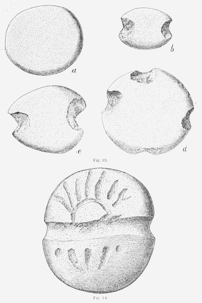 On the little bottom land along the western side of Cherry Creek, near its mouth, at the upper end of Yakima Canon, we found objects which show that the place had been a camping ground. This is immediately south of where an east and west road crosses the creek on the farm of Mr. Bull. On this village site were found the specimens catalogued under numbers 202-8213 to 8222, of which two are shown in Plate II, Fig. 12, and Fig. 52. The opposite side of this stream strikes one of the foothills of the uplands, the western extension of Saddle Mountains. On the top of this foothill, which overlooks the above mentioned village site, were a number of burials marked by circles of rocks.[15] In the rock-slide on the side of this hill, between these circles and the village site below, were a number of graves which are described in detail under numbers 99-4326-4332 and 202-8223-8258 on pages 164 to 166. Some of the objects found, many of which are recent and show contact with the white race, are shown in Figs. 71a, 72, 74, 78, 80, 82-86, 90, 92, 95, and 96.