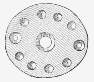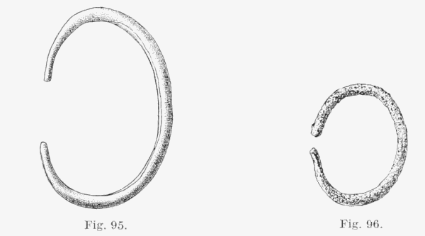 Copper was used for beads, pendants and bracelets. While all of this copper may have been obtained by barter from the whites, yet some of it may have been native. Copper, according to Spinden, was probably not known to the Nez Perce before the articles of civilization had reached that region, but he states that large quantities of copper have been taken from graves and that the edges of some of the specimens are uneven, such as would be more likely to result from beating out a nugget than from working a piece of cut sheet copper.[31] The glass beads, iron bracelets,[32] and bangles,[33] the brass rolled beads,[34] brass pendant[35] and the white metal inlay,[36] which we found, all came from trade with the white race during recent times and do not belong to the old culture.
