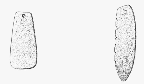 202-8386. Pendant made of haliotis shell, triangular in form, perforated at the most acute corner. This shell came from the Pacific Coast. Found in the grave of a child in a rock-slide near the head of Priest Rapids west of the Columbia River near the home of Mr. Craig (Fig. 89). Numbers 202-8387 to 202-8390 were also found here.