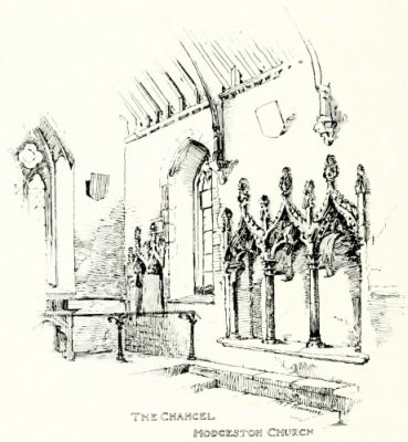 Our attention is next attracted by the gaily-tinted effigy of Willi[Pg 13]am Risam, who, clad in aldermanic robes, kneels beneath a canopy built into the chapel wall. The figure is coloured in such a life-like manner that, as the story goes, a Parliamentarian soldier fired at the supposed enemy; in witness whereof a bullet-hole may be discerned above the head of the effigy.