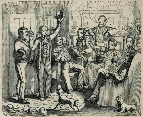One morning, Mr. Verdant Green and Mr. Bouncer were lounging in the venerable gateway of Brazenface. The former gentleman, being of an amiable, tame-rabbit-keeping disposition, was making himself very happy by whistling popular airs to the Porter's pet bullfinch, who was laboriously engaged on a small tread-mill, winding up his private supply of water. Mr. Bouncer, being of a more volatile temperament, was amusing himself by asking the Porter's opinion on the foreign policy of Great Britain, and by making very audible remarks on the passers-by. His attention was at length riveted by the appearance on the other side of the street, of a modest-looking young gentleman, who appeared to be so ill at ease in his frock-coat and "stick-up" collars, as to lead to the strong presumption that he wore those articles of manly dress for the first time.