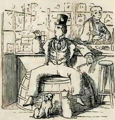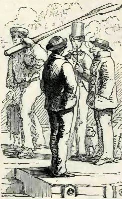 "I'll bet you a bottle of blacking, Giglamps," said little Mr. Bouncer, as he directed our hero's attention to the stranger, "that this respected party is an intending Freshman. Look at his customary suits of solemn black, as Othello, or Hamlet, or some other swell, says in Shakspeare. And, besides his black go-to-meeting bags, please to observe," continued the little gentleman, in the tone of a wax-work showman; "please to hobserve the pecooliarity hof the hair-chain, likewise the straps of the period. Look! he's coming this way. Giglamps, I vote we take a rise out of the youth. Hem! Good morning! Can we have the pleasure of assisting you in anything."