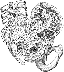 The size and hardness of the tumour seemed to leave no chance of the birth of a living child, even by the induction of premature labour. Professor D’Outrepont, who doubted whether the tumour was fibro-cartilaginous, or a true bony exostosis, asked the opinion of many eminent men who saw the case. They did not express themselves with certainty as to its nature, and the patient refused to allow an experimental incision to be made into the tumour.