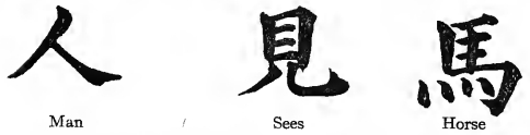 But Chinese notation is something much more than arbitrary symbols. It is based upon a vivid shorthand picture of the operations of nature. In the algebraic figure and in the spoken word there is no natural connection between thing and sign: all depends upon sheer convention. But the Chinese method follows natural suggestion. First stands the man on his two legs. Second, his eye moves through space: a bold figure represented by running legs under an eye, a modified picture of an eye, a modified picture of running legs but unforgettable once you have seen it. Third stands the horse on his four legs.