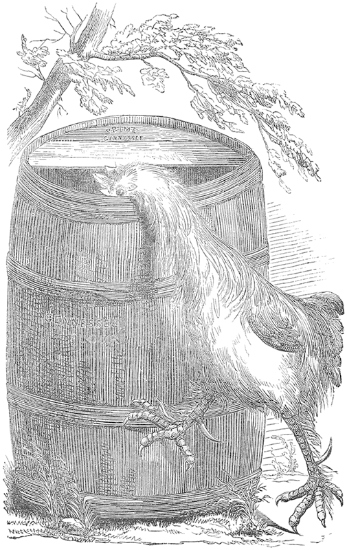 [9] "This gigantic bird," says Richardson, a noted English writer, "is very prolific, frequently laying two, and occasionally three eggs on the same day!" And, in support of this monstrous assertion, he subsequently refers, as his authority for this statement (which was called in question), to the "Rt. Hon. Mr. Shaw, Recorder of Dublin, to Mr. Walters, Her Majesty's poultry-keeper, and to J. Joseph Nolan, Esq., of Dublin." This was, in my opinion, one of the hums of the time, and I never had occasion to change that opinion. I do not believe the hen that really laid two eggs in one day ever lived to do it a second time! I have heard of this thing, however. But I never knew of the instance, myself.