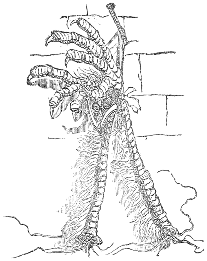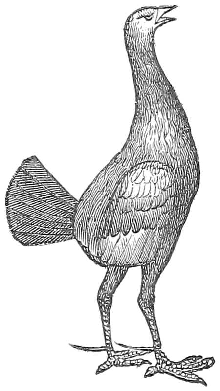 I am now well satisfied that the "Cochin-China" variety of fowl is a gross fable. If such a breed exist, in reality, we have never had them in this country. Anything (and everything) has been called by this name among us, in the last five years; but the engraving on the following page, in my estimation (and I have been there!), is the nearest thing possible to a likeness of this long petted bird; and will be recognized, I think, by more than one victim, as an[Pg 19] accurate and faithful portrait of this lauded "magnificent" and "superb" bird!