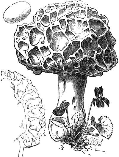 Every one knows the Morel—that expensive luxury which the rich are content to procure at great cost from our Italian warehouses, and the poor are fain to do without. It is less generally known that this fungus, though by no means so common with us as some others (a circumstance partly attributable to the prevailing ignorance as to when and where to look for it, or even of its being indigenous to England), occurs not unfrequently in our orchards and woods, towards the beginning of summer. Roques reports favourably of some specimens sent to him by the Duke of Athol; and others, from different parts of the country, occasionally find their way into Covent[133] Garden Market. The genus Morchella comprises very few species, and they are all good to eat. Persoon remarks, that though the Morel rarely appears in a sandy soil, preferring a calcareous or argillaceous ground, it frequently springs up on sites where charcoal has been burnt, or where cinders have been thrown.
