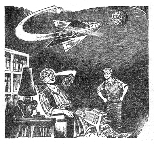 HE BROUGHT the Mark VII out of her orbit after two days of running rings around the spinning Earth, and the world loved him. He climbed out of the crackling, pinging ship, bearded and dirty, with oil on his face and in his hair, with food stains all over his whipcord, red-eyed, and huskily quiet as he said his few words into the network microphones. And he was not satisfied. There was no peace in his eyes, and his hands moved even more sharply in their expressive gestures as he gave an impromptu report to the technicians who were walking back to the personnel bunker with him.