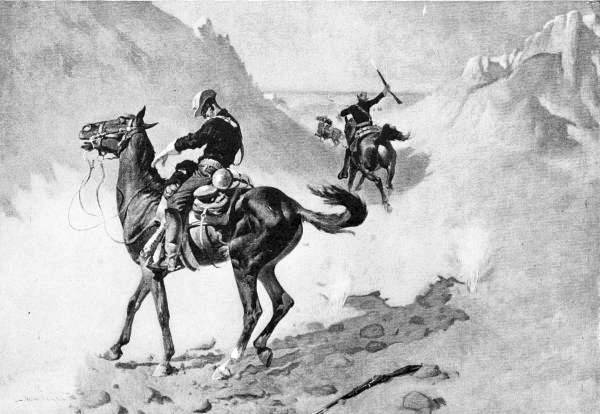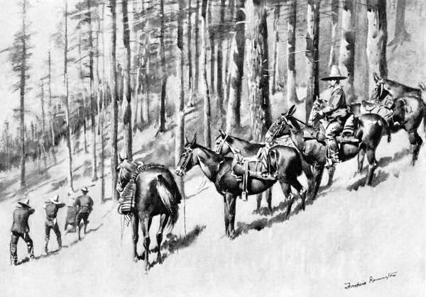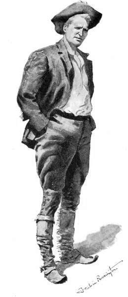I selected Captain Mickler—the immaculate, the polo-player, the epitome of staff form, the trappiest trooper in the Dandy Fifth—and, together with two orderlies, we started. Mickler was mounted on a cow-pony, which measured one chain three links from muzzle to coupling. Mickler had on English riding-togs—this is not saying that the pony could not run, or that Mickler was not humorous. But it was no new experience for him, this pulling a pony and coaxing him to attempt breakneck experiments, for he told me casually that he had led barefooted cavalrymen over these hills in pursuit of Apaches at a date in history when I was carefully conjugating Latin verbs.