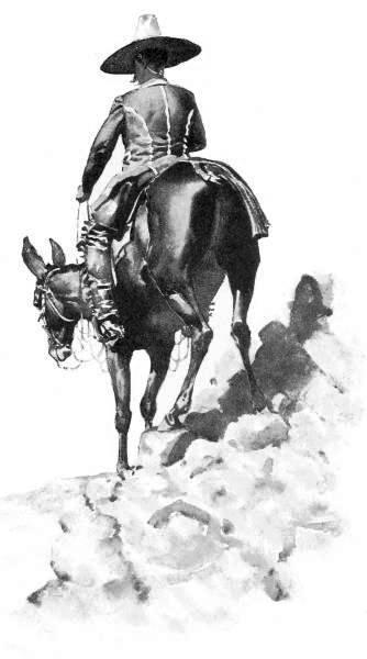 Dan, the foreman, was the huntsman. He was a shrewd-eyed, little, square-built man, always very much preoccupied with the matter in hand. He wore a sombrero modelled into much character by weather and time, a corduroy coat, and those enormous New-Mexican “chaps,” and he sounded a cow-horn for his dogs, and alternately yelped in a most amusing way. So odd was this yelp that it caught the soldiers, and around their camp-fire at night you could hear the mimicking shouts of “Oh, Rocks! eh-h-h! hooick! get down on him, Rocks; tohoot! tohoot!” We were sitting about on our horses in a little sienneca, while Dan was walking about, leading his pony and looking after his dogs.