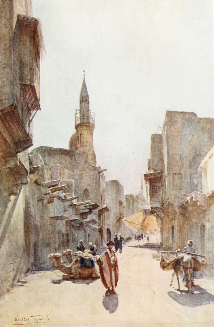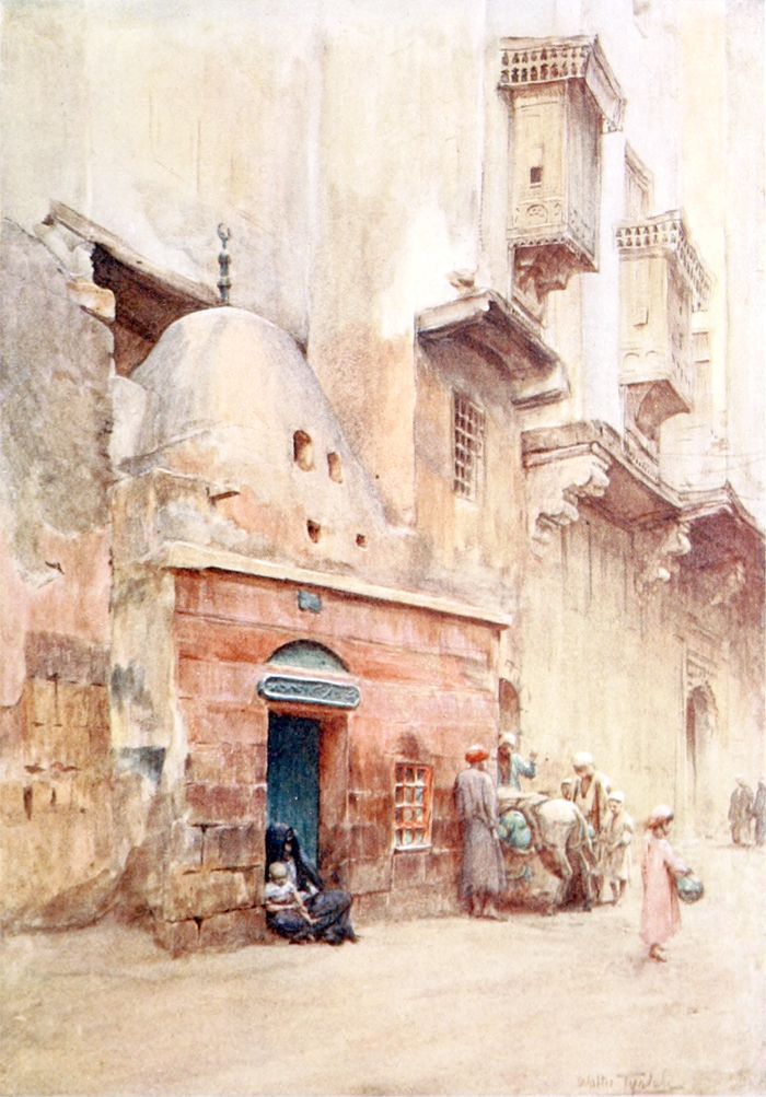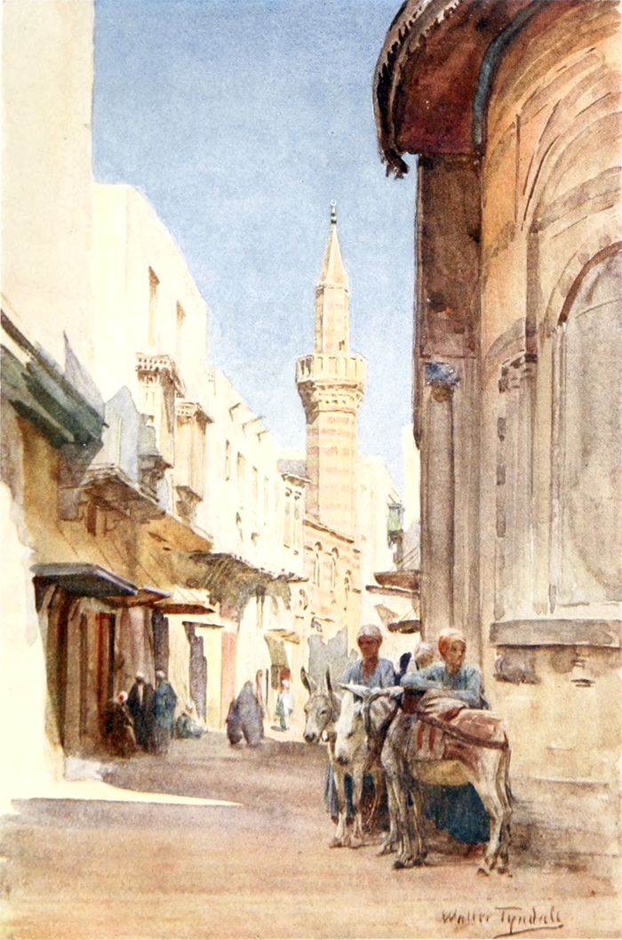L'aquarelle ci-contre représente les deux minarets de El Muaiyad qui s'élèvent si gracieusement au-dessus de cette porte de tragique mémoire. Les maisons avoisinantes cachent la porte elle-même, qui a tenté les crayons ou les pinceaux de bien des artistes. L'espace qui l'entoure est trop restreint, et après tout il est peut-être préférable que le lieu sinistre d'où s'élèvent ces ravissants minarets reste caché.