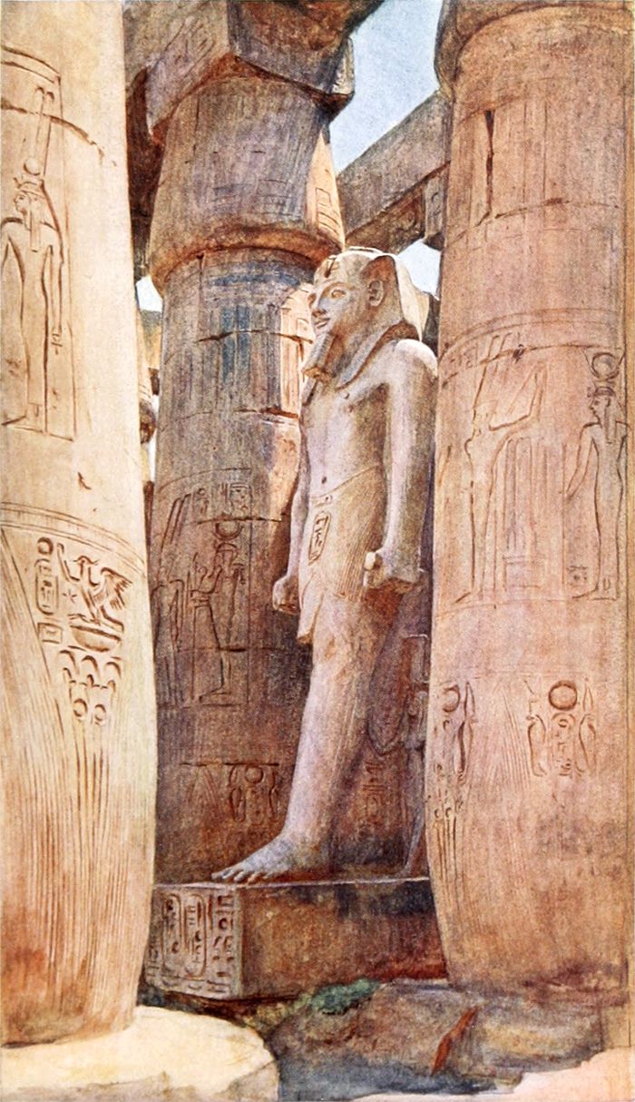 Nous dépassons le grand pylône pour pénétrer dans le hall hypostyle élevé par Seti I et terminé par Ramsès II. En entrant pour la première fois dans ce hall orné de 134 colonnes, on ressent quelque chose de l'effroi et de la surprise qu'inspire une première vue des Pyramides, mais ici un art plus raffiné a aidé la force brutale dans la construction de cette œuvre monumentale. Ce que nous voyons suffit pour nous permettre d'imaginer l'impression que l'édifice entier devait produire; telles qu'elles sont, ce sont les ruines les plus grandioses de l'univers.