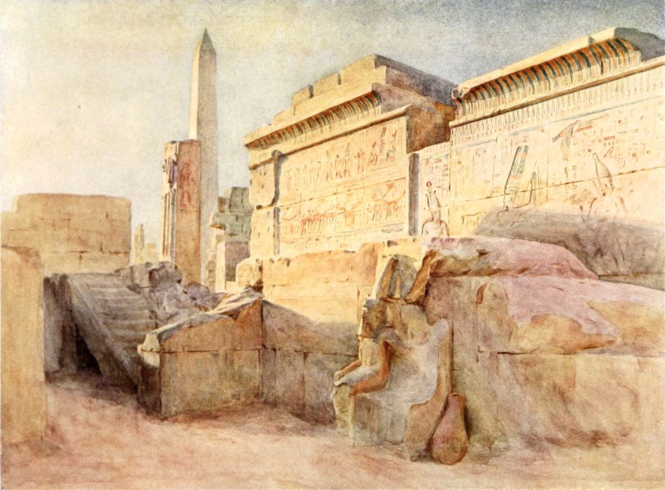 Lorsque nous atteignîmes Karnak, mon ami Erskine Nicol fit jeter l'ancre à cinq minutes du grand 209 temple. Howard Carter m'avait donné une lettre d'introduction auprès de M. Legrain qui était à la tête des travaux de Karnak et qui est un des hommes les mieux renseignés de notre temps sur cette partie de la contrée; ma première matinée se passa en compagnie de cet aimable Français et de Nicol, à visiter les temples de la région. M. Legrain nous conta l'histoire de Karnak et nous fit remarquer le développement de cette citée dédiée à Ammon. Nous trouvâmes des traces de son histoire depuis la douzième dynastie jusqu'à l'ère chrétienne, soit pendant une période de deux mille ans. On peut y voir aussi des vestiges des temps archaïques, mais comme je ne veux parler ici que des monuments intéressants au point de vue artistique, je laisserai de côté ces ruines des premiers âges. M. Legrain est un artiste élève de l'École des Beaux-Arts et sa connaissance des lieux jointe à ses qualités artistiques en font un guide unique.