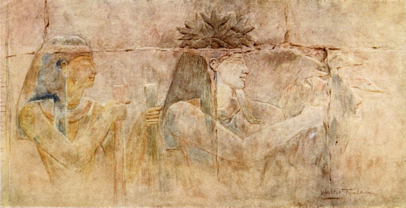 Le peu de temps dont je pouvais disposer m'empêcha de traiter mon sujet aussi à fond que je l'aurais désiré. La ligne onduleuse des bras amène notre regard à la droite de la gravure; au delà se trouve l'objet d'adoration. On distingue à peine les oiseaux qui sont offerts au dieu, mais combien ils remplissent joliment l'espace! Ici, la ligne de la composition s'arrête net et les têtes des oiseaux conduisent le regard vers le dieu que le roi cherche à fléchir. Quelle couronne pourrait être plus belle que celle, faite de fleurs de lotus, qui ceint le front du jeune Pharaon?