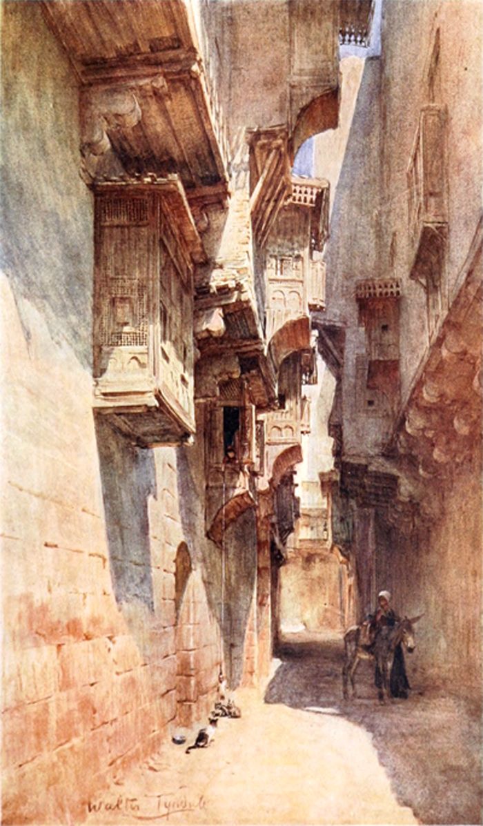 Une petite rue étroite qui longe la Merdani nous conduit dans une artère plus large, dont les maisons évoquent une aristocratie déchue. L'une d'elles, avec un portail majestueux et de grandes bay windows dont les stores de bois sculpté sont brisés et raccommodés çà et là au moyen de morceaux de caisses d'emballage, semblerait indiquer que son propriétaire est complètement ruiné, à moins, au contraire, que ses affaires ne soient si prospères qu'il ait pu se construire une autre habitation dans le nouveau quartier d'Ismalieh en laissant son ancienne demeure à la garde des rats et d'un vieil eunuque. J'ai souvent trouvé dans ces vieilles maisons des cours fort intéressantes, mais il est difficile d'en obtenir une bonne vue. La porte massive est souvent ouverte, mais le passage qui conduit à l'intérieur de la cour fait généralement un brusque coude au bout de quelques mètres, coupant ainsi la perspective.